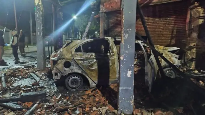 A raíz del impacto, el auto se prendió fuego, al igual que el frente del local, por lo que tanto los bomberos como una ambulancia acudieron al lugar para prestar asistencia.