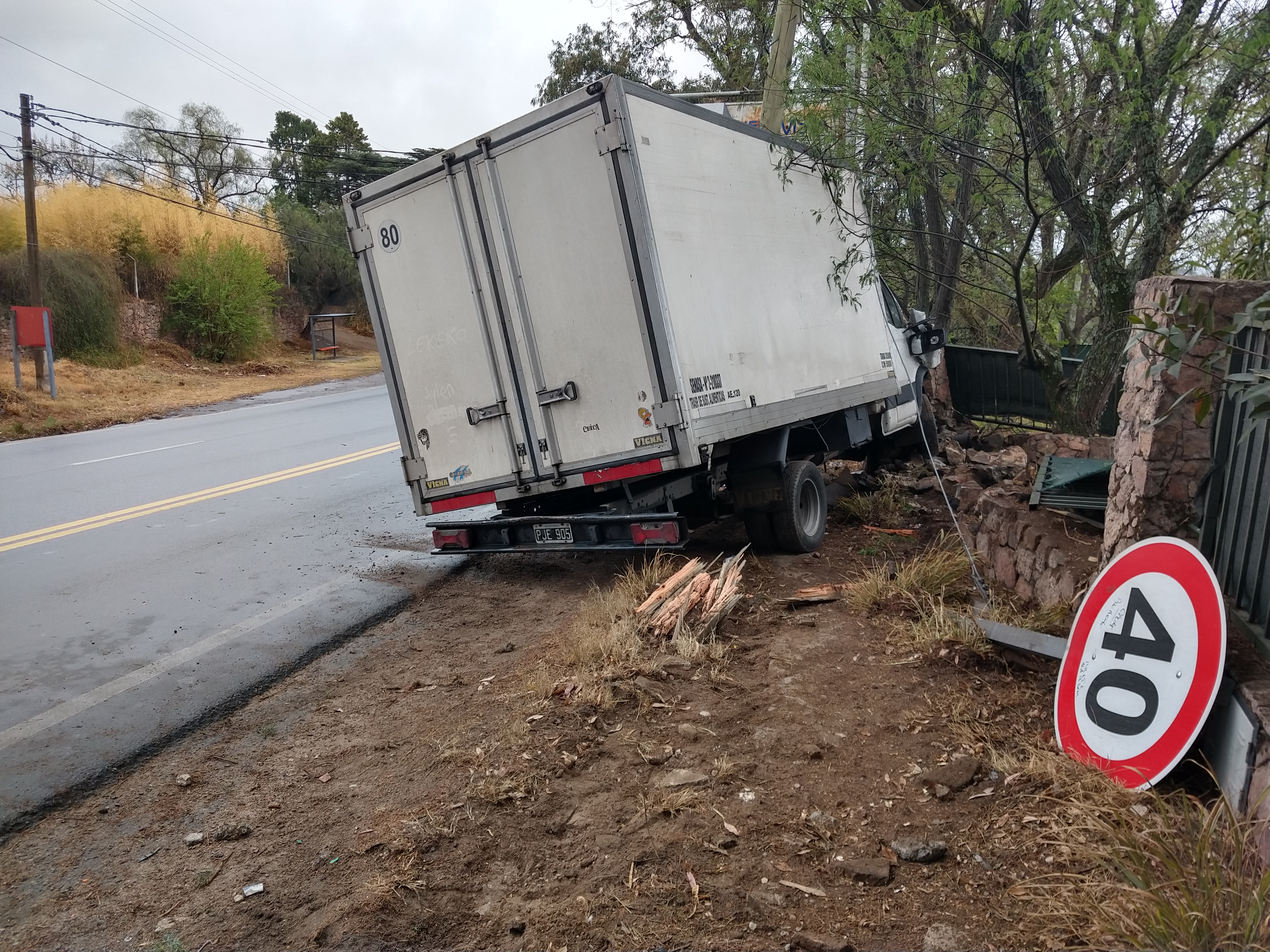Este martes a la mañana, un camión Iveco Daily chocó contra un poste de tendido de energía eléctrica y carteles de señales de tránsito, y terminó incrustado en la pirca de una casa, ubicada sobre la ruta 38, a la altura del ingreso Lake Buena Vista, en Villa del Lago.