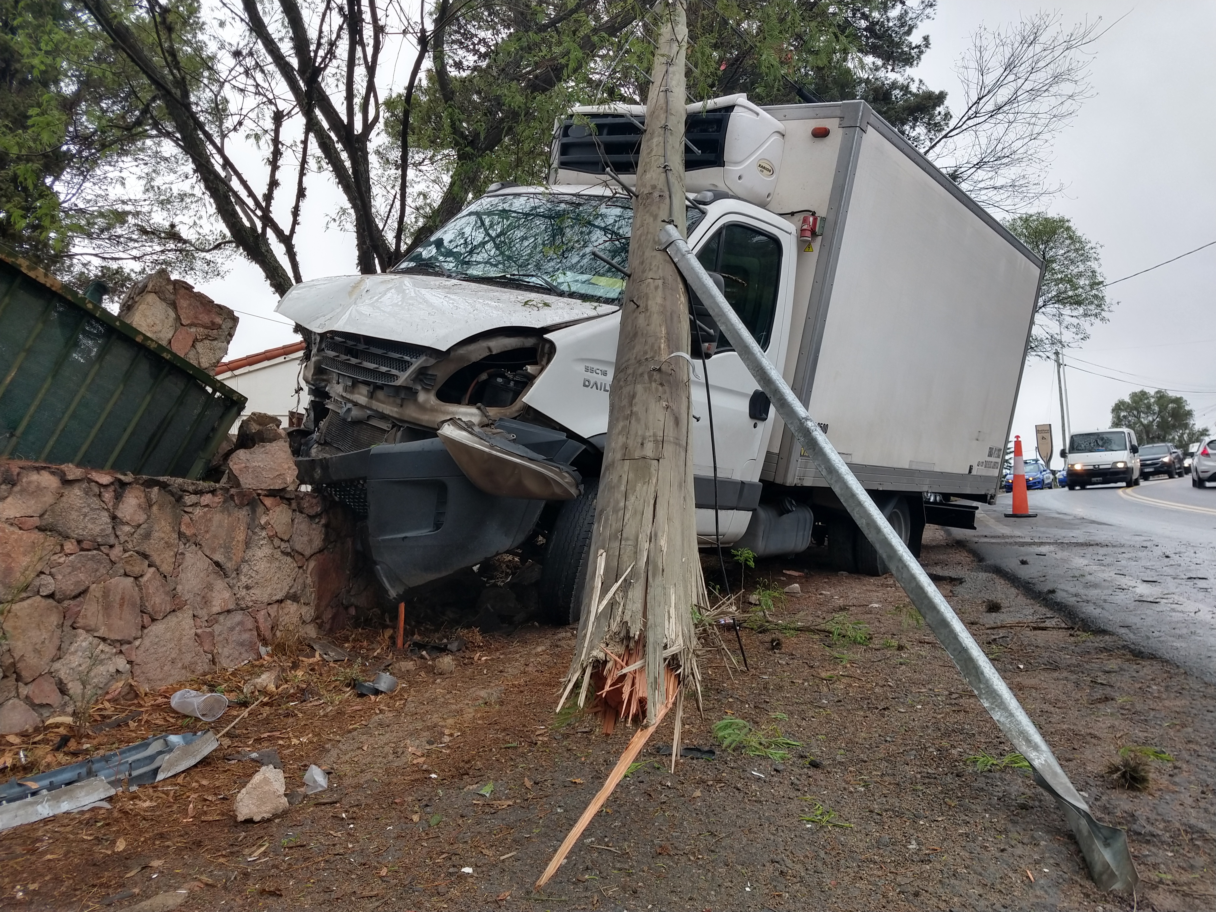 Este martes a la mañana, un camión Iveco Daily chocó contra un poste de tendido de energía eléctrica y carteles de señales de tránsito, y terminó incrustado en la pirca de una casa, ubicada sobre la ruta 38, a la altura del ingreso Lake Buena Vista, en Villa del Lago.