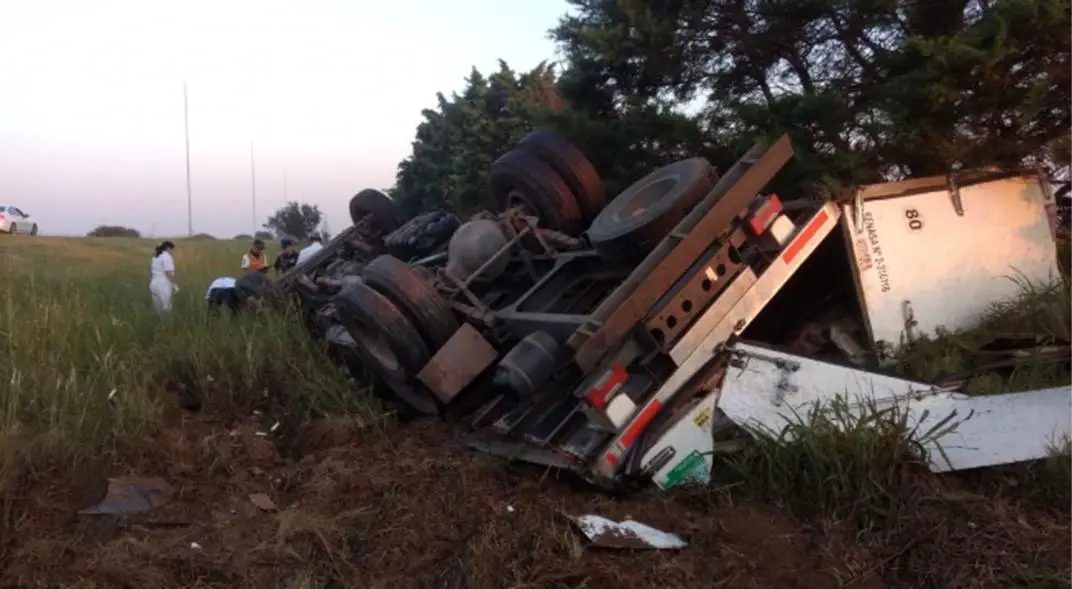 El camión Iveco de la empresa Distimeat, de Buenos Aires, que llevaba siete mil kilos de carne de vaca, volcó en el kilómetro 685 (entre el puente de Toledo y el de Camino a Capilla de los Remedios).