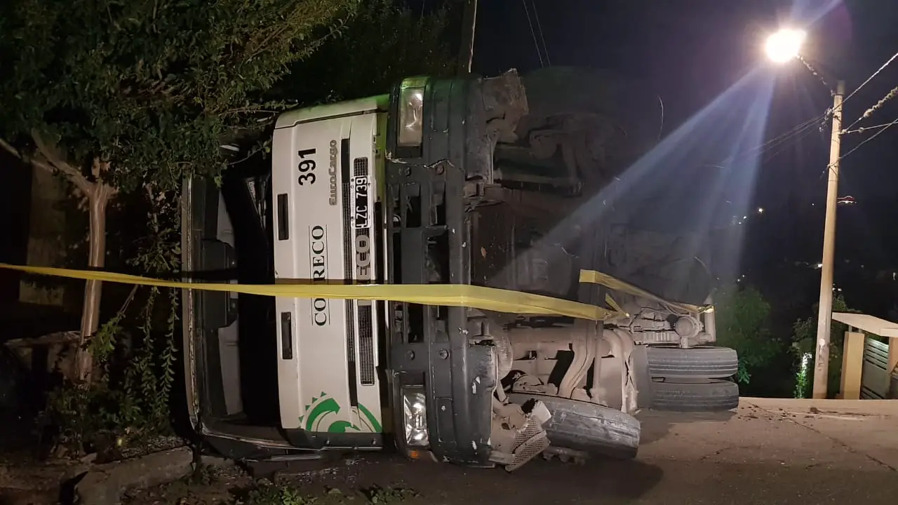 Los vecinos de barrio La Cuesta escucharon un fuerte ruido en la noche de este miércoles. Cuando salieron a mirar a la calle se encontraron con que un camión recolector de residuos de la empresa Cotreco se había dado vuelta.