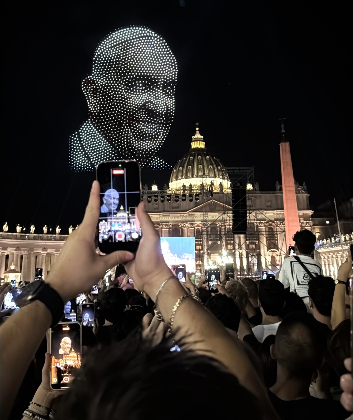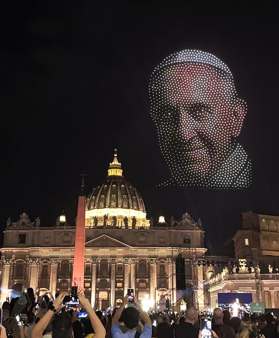 El Vaticano fue también escenario de una novedad: más de 3.000 drones iluminaron la cúpula de San Pedro con figuras inspiradas en los frescos de la Capilla Sixtina, en un espectáculo aéreo que sorprendió a los miles de asistentes.