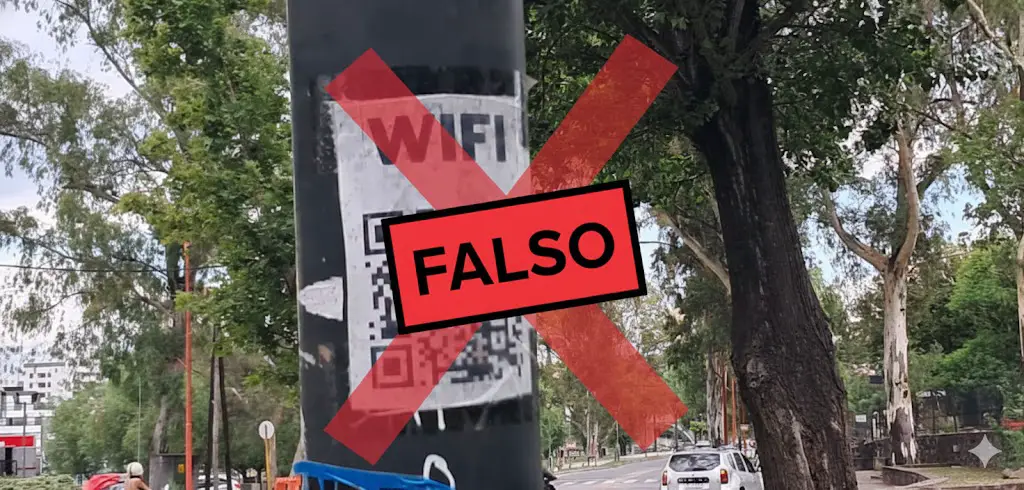 En torno al edificio municipal, sobre avenida San Martín este lunes había muchos carteles de este tipo en postes de alumbrado público. Invitan a abrir el QR en el celular con la excusa de una conexión de WIFI gratuita. No caigas, es mentira.