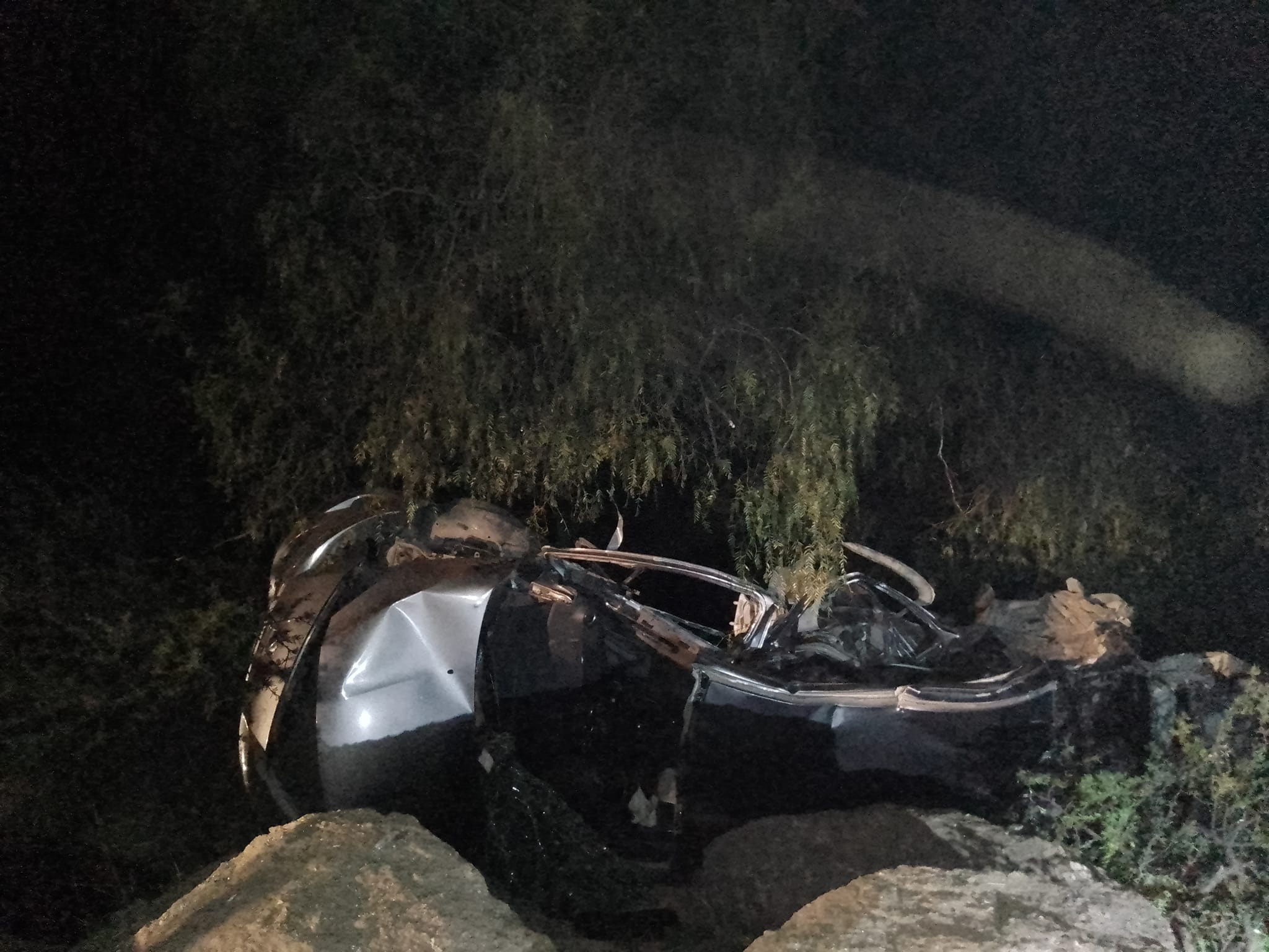 El auto, un Peugeot 308, quedó totalmente destruido al lado de la roca con la que impactó.
