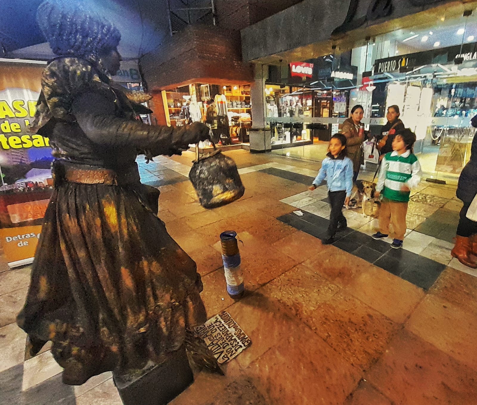 Claudia es una de las estatuas vivientes que eligió Carlos Paz para trabajar en este invierno y es el atractivo de los chicos que pasan por el frente del a Galería L´Strada y la encuentran ataviada con las vestimentas típicas de una china de la pampa argentina.
