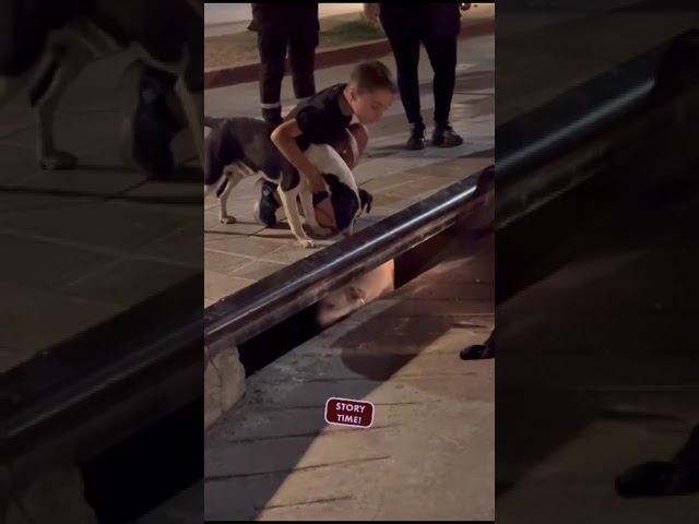 El perro blanco quedó atrapado en una alcantarilla y su amigo canino fue quien alertó a la gente del lugar que semejante perrote había quedado encerrado. El perro blanco y negro ladraba desesperado para que sacaran a su compañero de allí, quien tenía miedo y tiraba tarascones al aire.