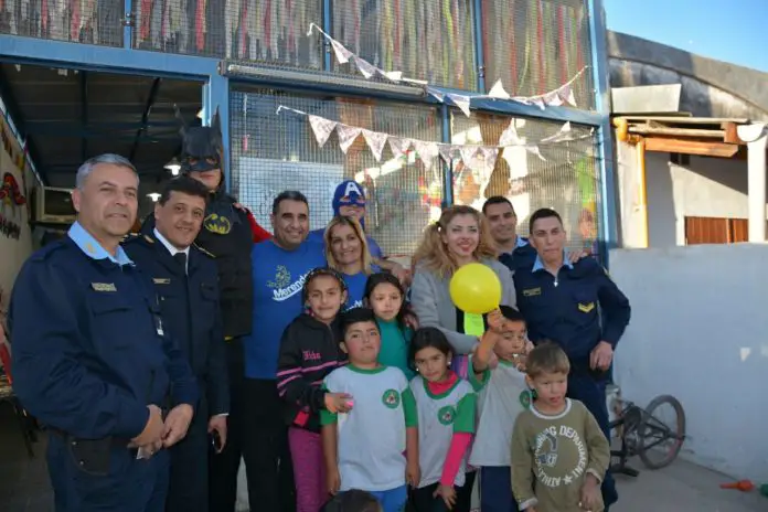 Este martes, un grupo de compañeros de Cristian, acompañados por el jefe de la Departamental, Leonardo Páez Stelchman, cayeron de sorpresa vestidos de superhéroes mientras muchos niños merendaban. ¿El objetivo? Brindarle a la familia Abrate su acompañamiento con mercadería necesaria y obsequiarles regalos a los chicos.