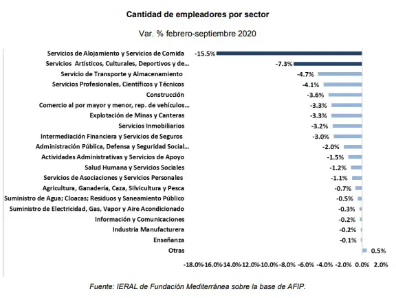 En segundo lugar, se destaca el decrecimiento de 7,3% en servicios artísticos, culturales, deportivos y de esparcimiento, que también tiene una fuerte vinculación con el sector turístico. En términos absolutos, en el caso de alojamientos y restaurantes en septiembre se verificaron 4.342 empleadores menos que en febrero.