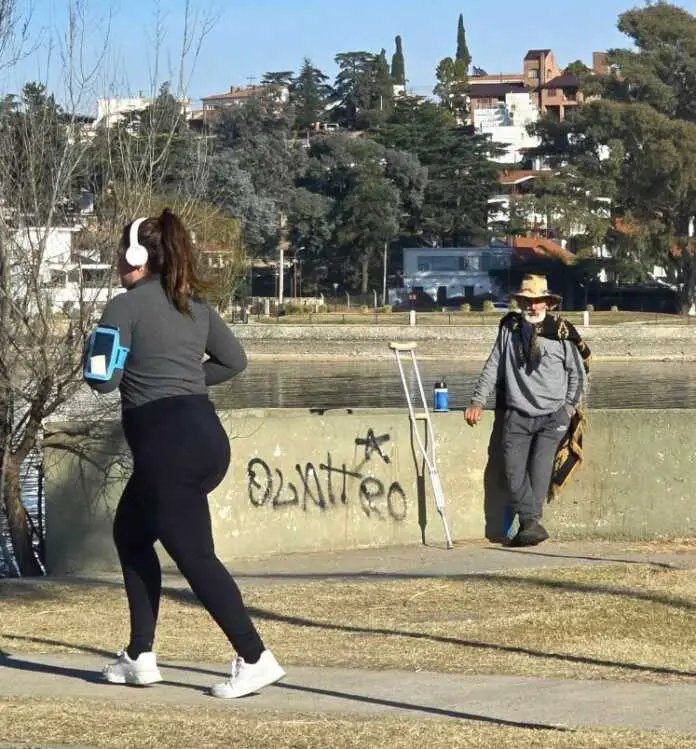Y si, la foto no becesita explicación… pero lo mismo la tiro. Veo al caballero, mateando al sol, con muleta y chambergo, freno la #RenoletaEternautica para registrar la escena, pero pr el rabillo del ojo derecho la veo venir a la ‘runner’, en tenaz trote y escuchando… a ver… o sea… digamos… no me animo a arriesgar su ‘playlist’…