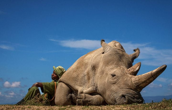 Una imagen que conmueve es la fotografía de Naji y su amigo y cuidador Zachary Mutai. En ella se los aprecia descansando tranquilamente bajo el sol de Ol Pejeta COnservancy en Kenia, África.