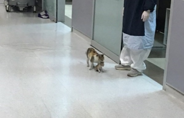 Una gata callejera llevó a su cachorro por el cuello a la sala de urgencias de un hospital. Allí los médicos se dieron cuenta que buscaba atención para su cría y se la dieron.