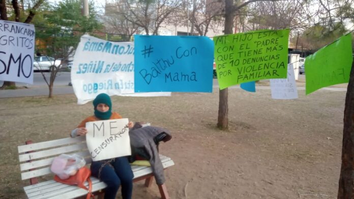 En la tarde de este viernes, una mujer se encadenó a un banco de la plaza del Club Argentino de Servicio para pedir que la justicia actúe y poder reencontrarse con su hijo, quien se fue con su padre y no volvió.