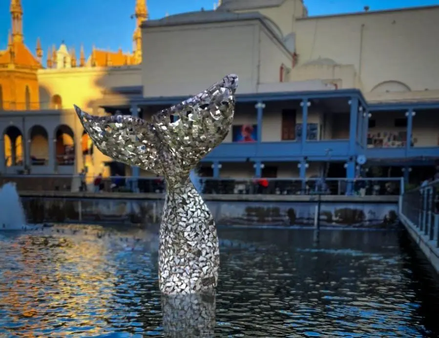 Se trata de una cola de ballena de gran porte realizada en metal, la cual podrá verse en la fuente de aguas danzantes.