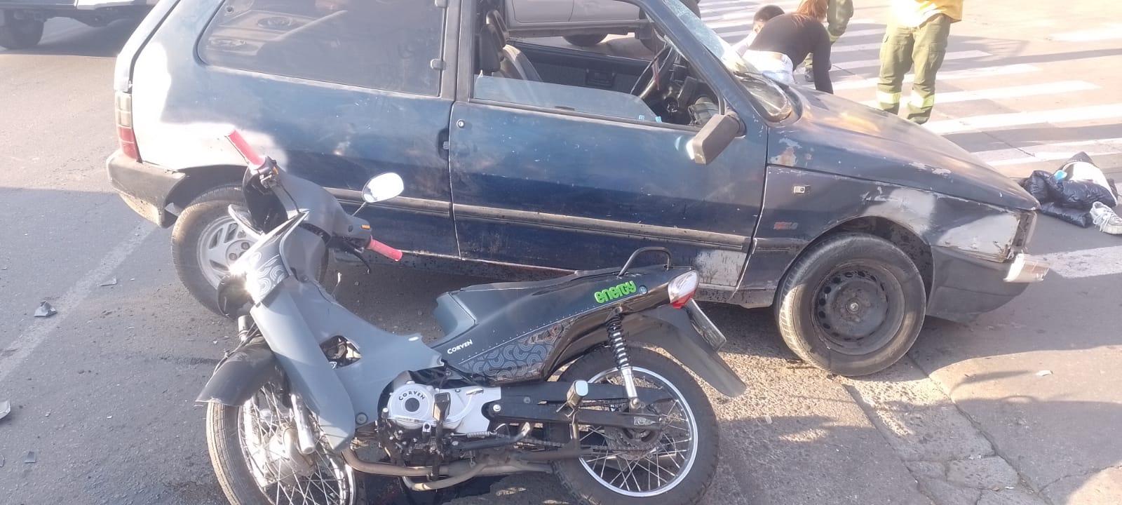 Este domingo, aproximadamente a las 18 horas, se registró un accidente de tránsito en la intersección de Av. Cárcano y Jujuy, en el Barrio Miguel Muñoz de Carlos Paz. Personal policial se dirigió al lugar tras recibir el aviso y procedió a entrevistar a los involucrados en el siniestro: un hombre de 42 años que conducía un vehículo Fiat Uno y una mujer de 23 años que se desplazaba en una motocicleta Corven Energy 110cc.