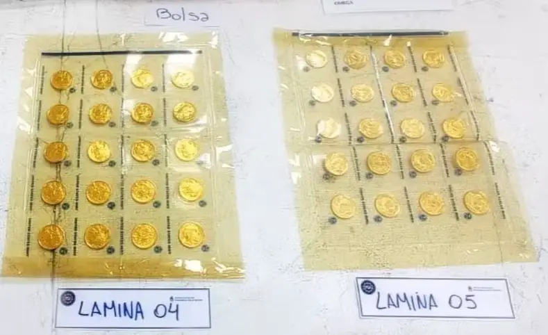 Una mujer fue retenida en la terminal B del Aeropuerto Internacional de Ezeiza cuando se constató que pretendía abordar un vuelo a Miami con casi 420 monedas de oro, casi seis kilos de metal precioso, en sus valijas.