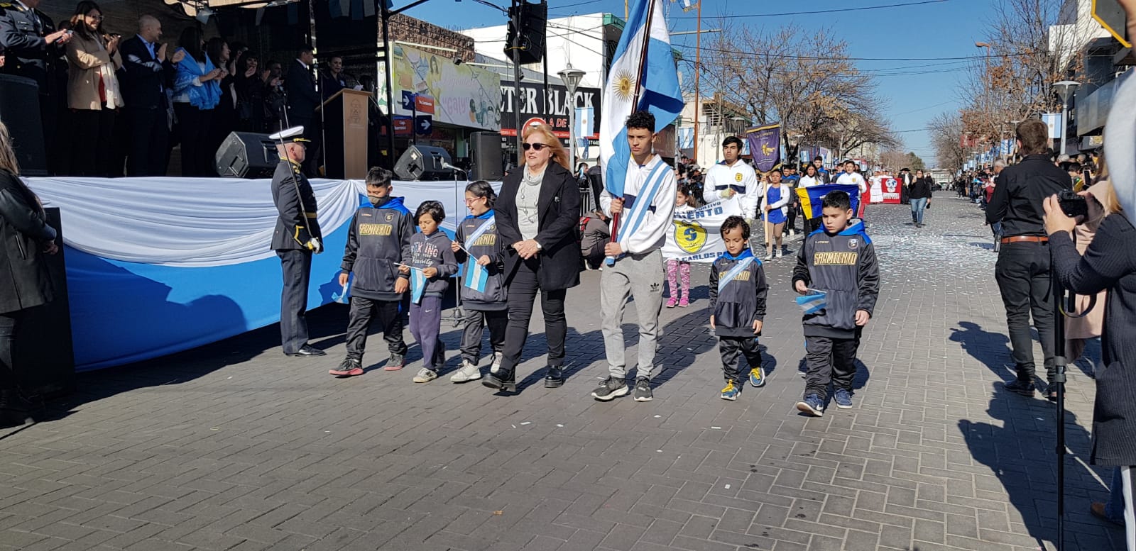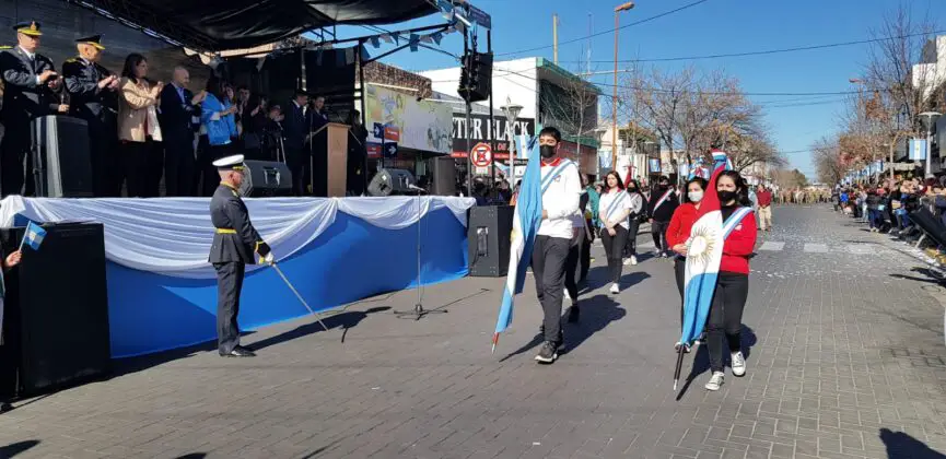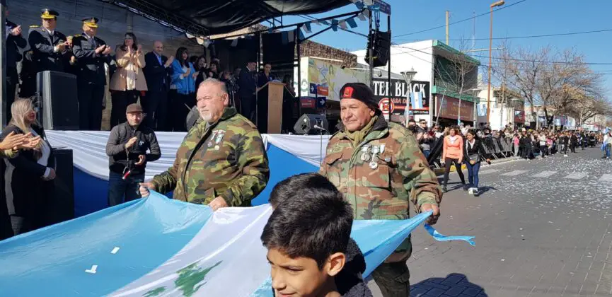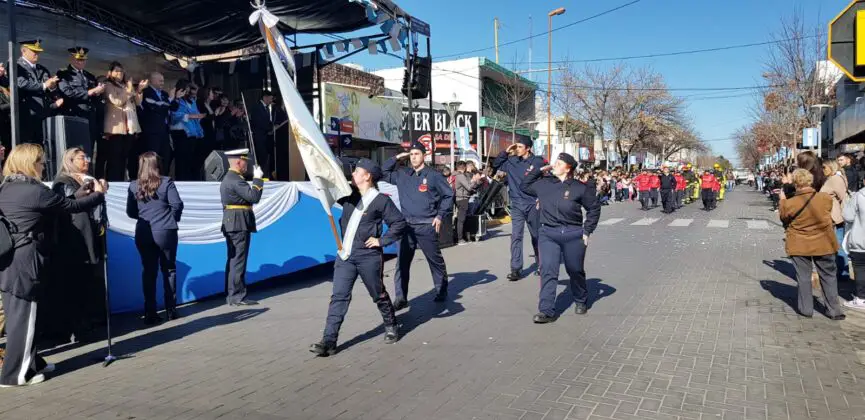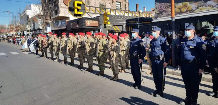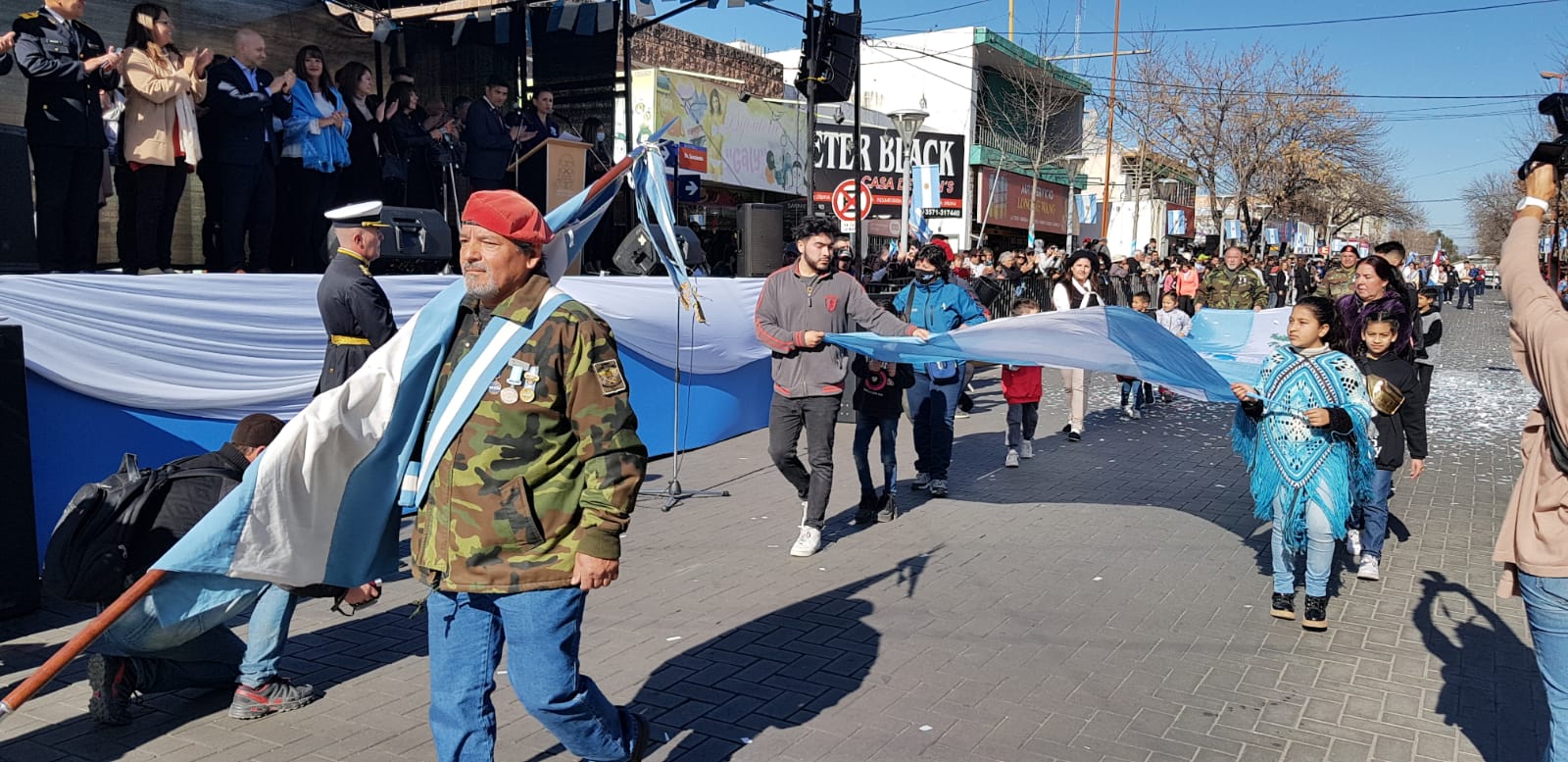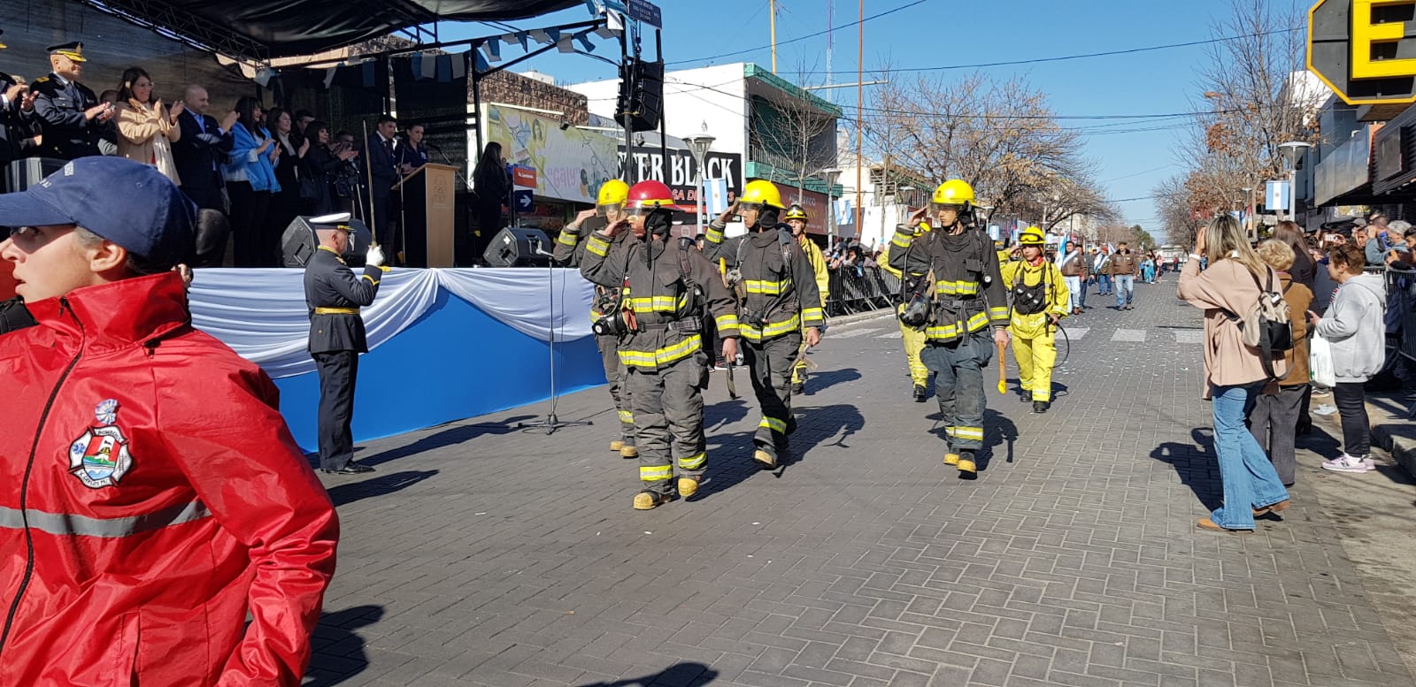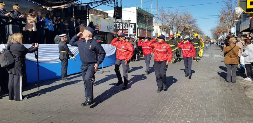 Miembros de las Fuerzas Armadas, la Policía de la Provincia, Bomberos Voluntarios, Veteranos de Malvinas, alumnos de las escuelas locales y fuerzas vivas participaron del desfile en las calles del centro de la ciudad.
