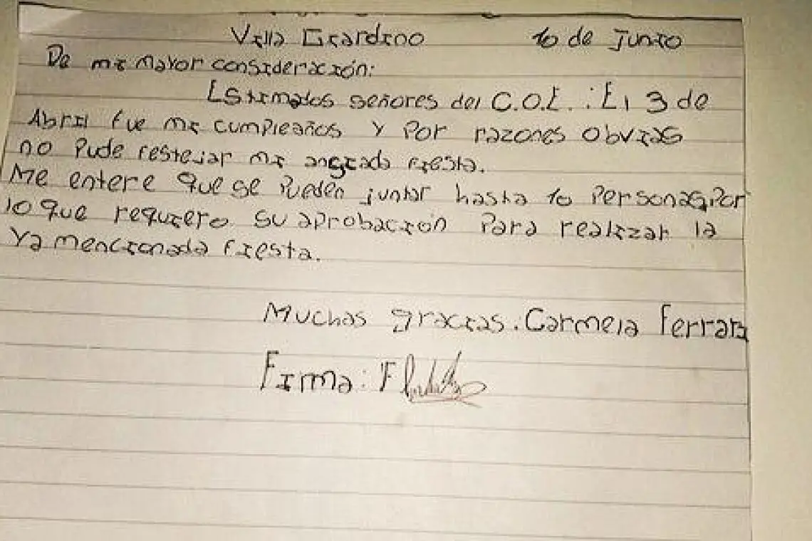 «Estimados señores del COE, el 3 de abril fue mi cumpleaños y por razones obvias no pude festejar mi ansiada fiesta. Me enteré que se pueden juntar hasta diez personas, por lo que requiero su aprobación para realizar la ya mencionada fiesta», expresa la misiva fechada el 10 de junio y firmada por Carmela.