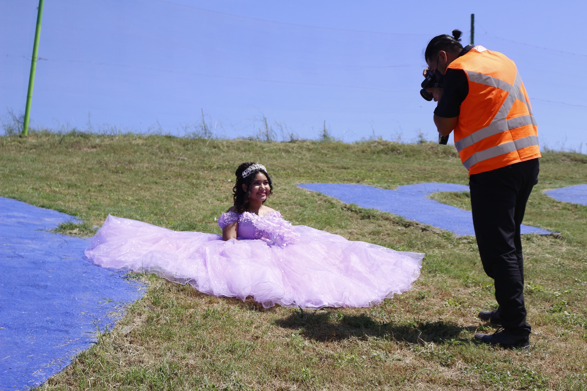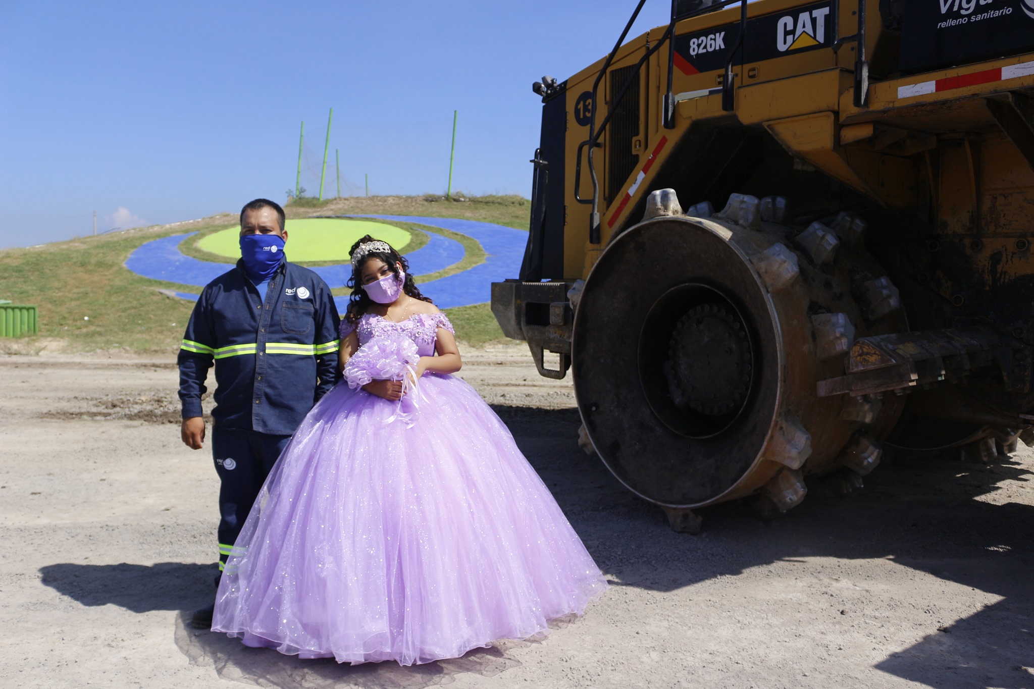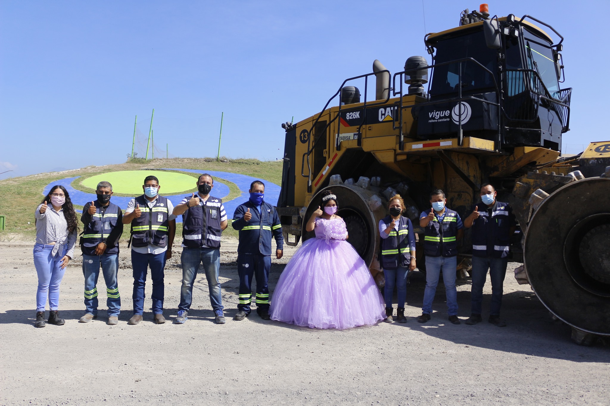 En las imágenes aparece la cumplañera con un vestido lila, un ramo de flores y tapaboca a juego, en diferentes partes de Vigue Relleno Sanitario.