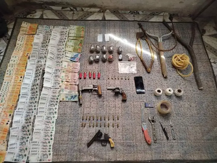 Durante el operativo realizado en una casa del barrio Caritas, la policía secuestró tres armas de fuego (una de ellas de fabricación casera) de calibres 33mm, 22mm y 16mm, junto con varios cartuchos. También se encontraron dos honderas de metal, varios metros de goma de suero, y nueve pelotas compactadas de marihuana, además de un envoltorio de cocaína, dos blíster de pastillas de clonazepam, un teléfono celular, dos plantas de marihuana, y $480.000 en efectivo.