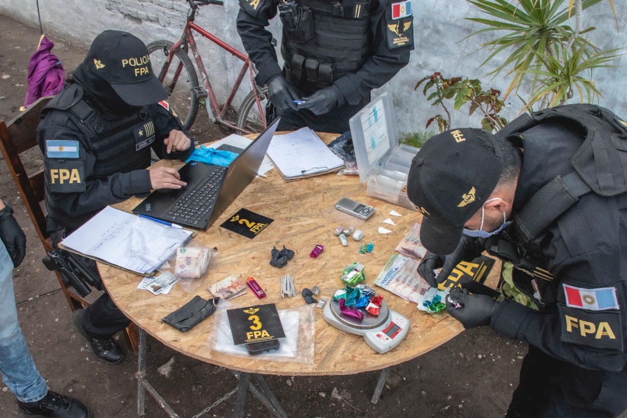 En los inmuebles, efectivos de la FPA incautaron 683 dosis de cocaína y 2.085 de marihuana distribuidas en varios envoltorios de diferentes tamaños y un ladrillo, además de una pastilla de psicofármaco (Rohypnol), dos bolsas con sustancia de corte, dinero y elementos relacionados la causa.