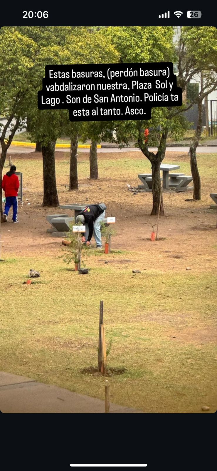 Tres sujetos visiblemente alterados atacaron el mobiliario de una plazoleta ubicada en barrio Sol y Lago y destruyeron especies de árboles nativos que se habían plantado en el lugar.