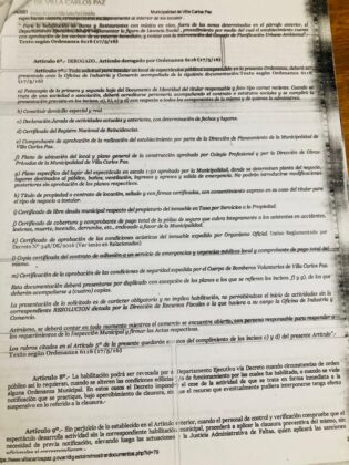 Asimismo, a estos negocios se les solicita “el certificado de aprobación de las condiciones acústicas del inmueble y la certificación de la aprobación de  las condiciones de seguridad, expedida por el cuerpo de Bomberos Voluntarios de Villa Carlos Paz”.