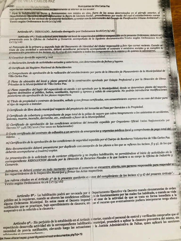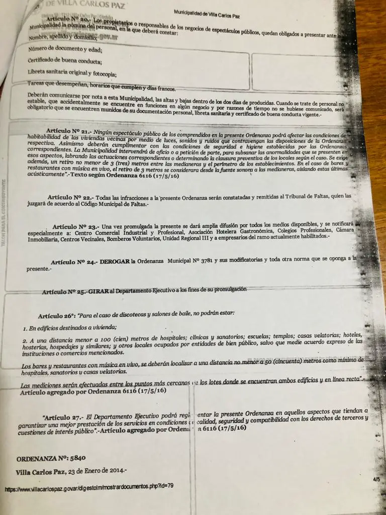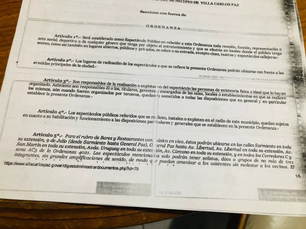 La ordenanza 5840 de Villa Carlos Paz, con fecha del 23 de enero de 2014, en su artículo 5, establece quepara el rubro de bares y restaurantes con música en vivo, solo podrán ser solistas, dúos o grupos de no más de tres integrantes, sin grandes amplificaciones de sonido, de modo que puedan amenizar a los asistentes sin molestar a los vecinos”. Además el documento detalla todos los requisitos necesarios para que estos lugares puedan funcionar.