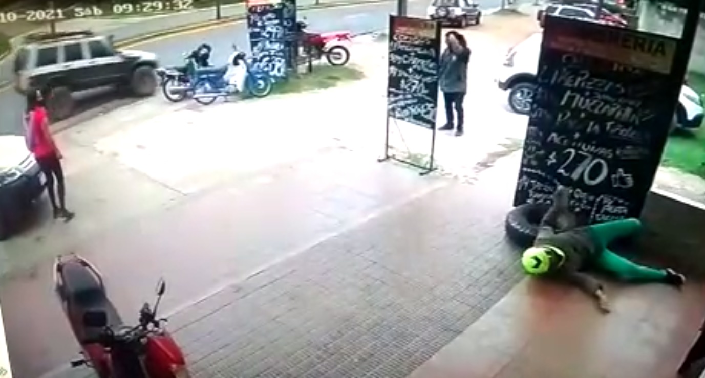El video captado por las cámaras de seguridad de un local comercial de la avenida Cárcano circuló por Whatsapp la semana pasada. Muestra a una mujer con casco puesto que estaba de pie frente a un local comercial consultando su teléfono celular. De repente, en la imagen aparece un neumático que ingresa a toda velocidad y golpea a la mujer.