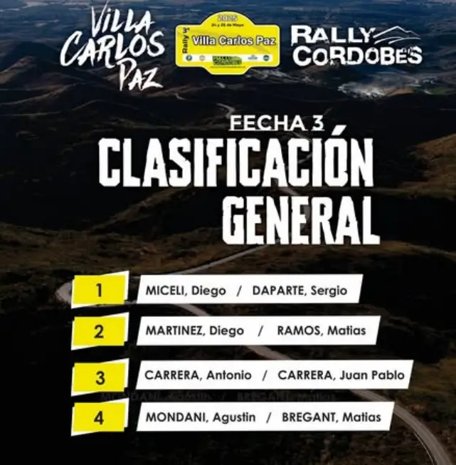 Hasta el momento, los líderes de la general son Diego Miceli/Sergio Daparte (Hyundai), Diego Martínez/Matías Ramos y Antonio Carrera/Carrera, ambos en Skoda.