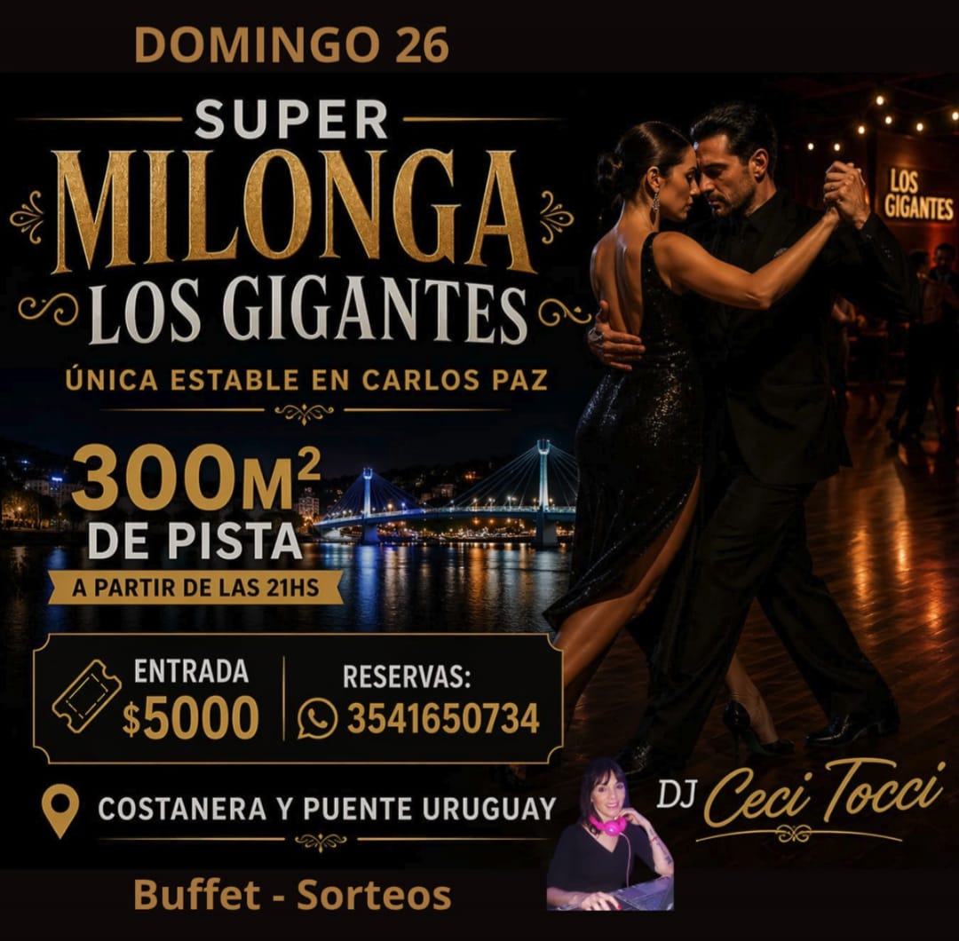 Domingos (21:00 a 02:00 h): “Milonga Los Gigantes”. Club Los Gigantes (junto al Puente Uruguay). Reservas: 3541-650734. (Frecuencia semanal).