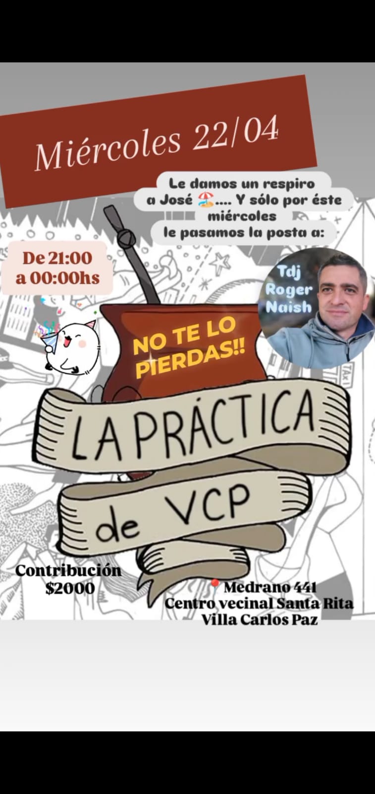 Miércoles (21:00 a 00:00 h): “La Práctica VCP”. Centro Vecinal Santa Rita (Medrano 441). Instagram: @lapractica.vcp. (Frecuencia semanal).