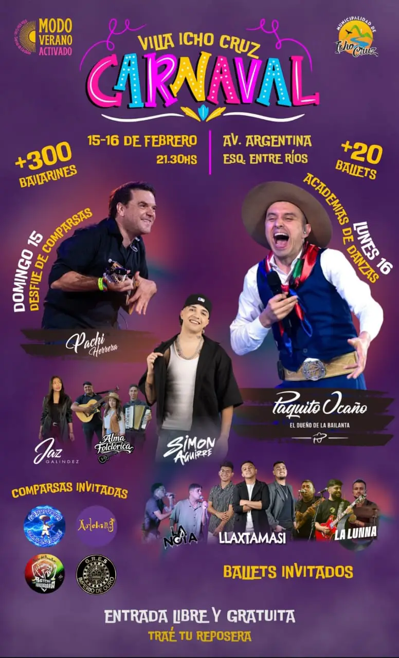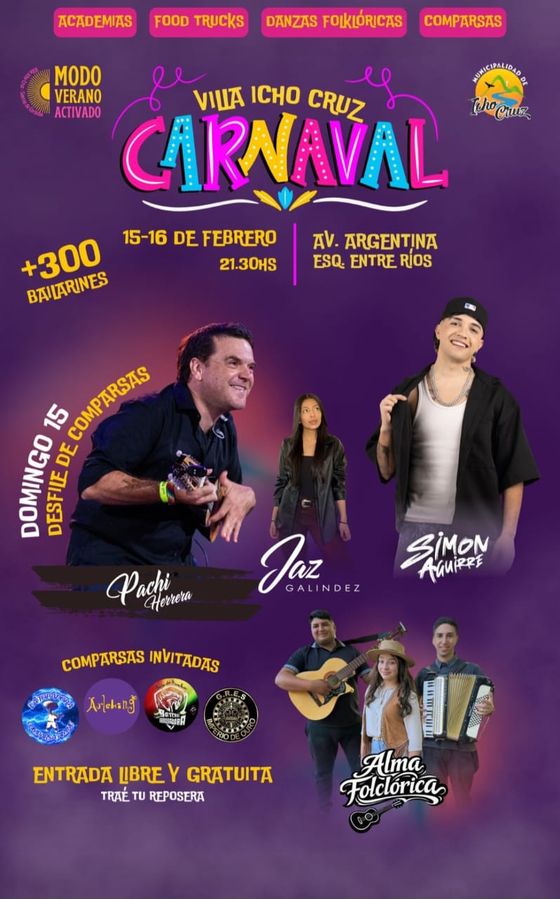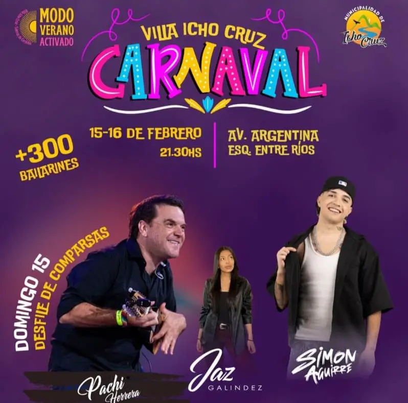 Villa Icho Cruz se prepara para vivir una nueva edición del Carnaval 2026 con una propuesta que promete música, color y movimiento para toda la familia. La celebración tendrá lugar el domingo 15 y lunes 16 de febrero, desde las 21.30, sobre avenida Argentina esquina Entre Ríos, en pleno corazón de la localidad.