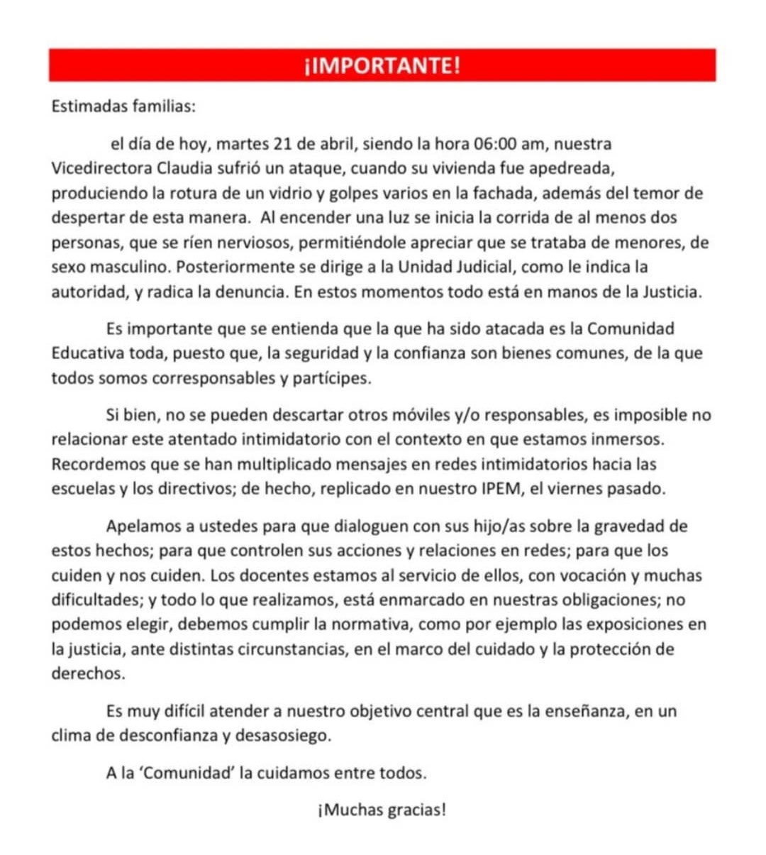 En ese contexto, no se descarta la relación con un menor de la localidad que fue imputado por su presunta participación en amenazas previas, lo que refuerza la hipótesis de un clima de hostigamiento hacia directivos y docentes.