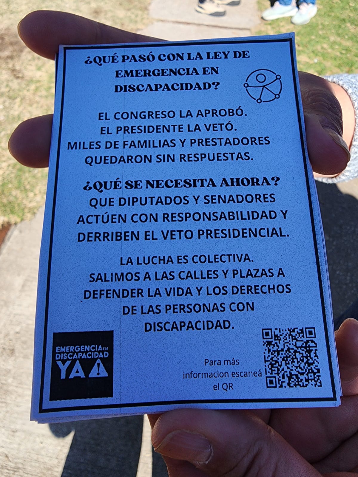 “Estamos apoyando a todas las familias y ciudadanos que se han convocado en distintas plazas del país para pedir no al veto de la ley de emergencia en discapacidad”, señalaron los organizadores durante la actividad, que incluyó entrega de folletería, diálogo con vecinos y acciones de concientización.