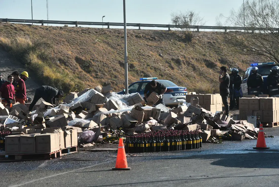 En total se cayeron unos 36 pallets de madera llenos de botellas y varias cajas de champagne, que dejaron líquidos esparcidos por toda la carpeta asfáltica, y un fuerte olor etílico en toda la zona.