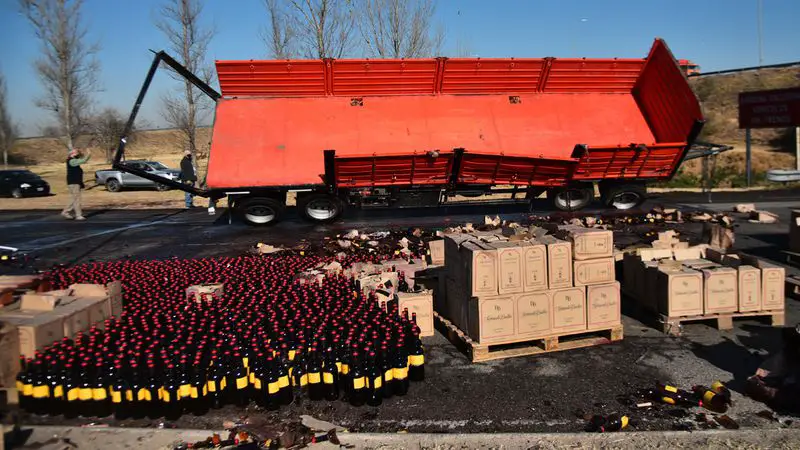 Por fortuna, el conductor del vehículo salió ileso del accidente, mientras que cientos de botellas terminaron destrozas en el asfalto, lo que provocó demoras en el tránsito.