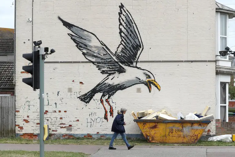 Lo cierto es que en los últimos días han aparecido tres obras fieles a su estilo, que mezclan la pintura en la pared con objetos reales, como un niño jugando (o trabajando) con una calle rota o una gaviota comiendo de un contenedor con basura.