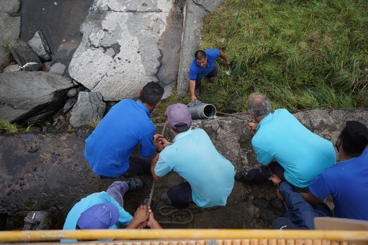 Este viernes, tras muchas horas de labor, los operarios del servicio lograron destapar el conducto y lo celebraron. Luego, una pieza importante fue arrastrada por el agua y se arrojaron a buscarla.
