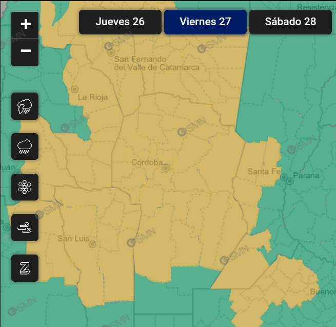 Desde el Servicio Meteorológico Nacional emitieron un alerta amarillo para la madrugada y primeras horas del viernes por tormentas, ráfagas de vientos y probable caída de granizo en gran parte de la provincia de Córdoba.