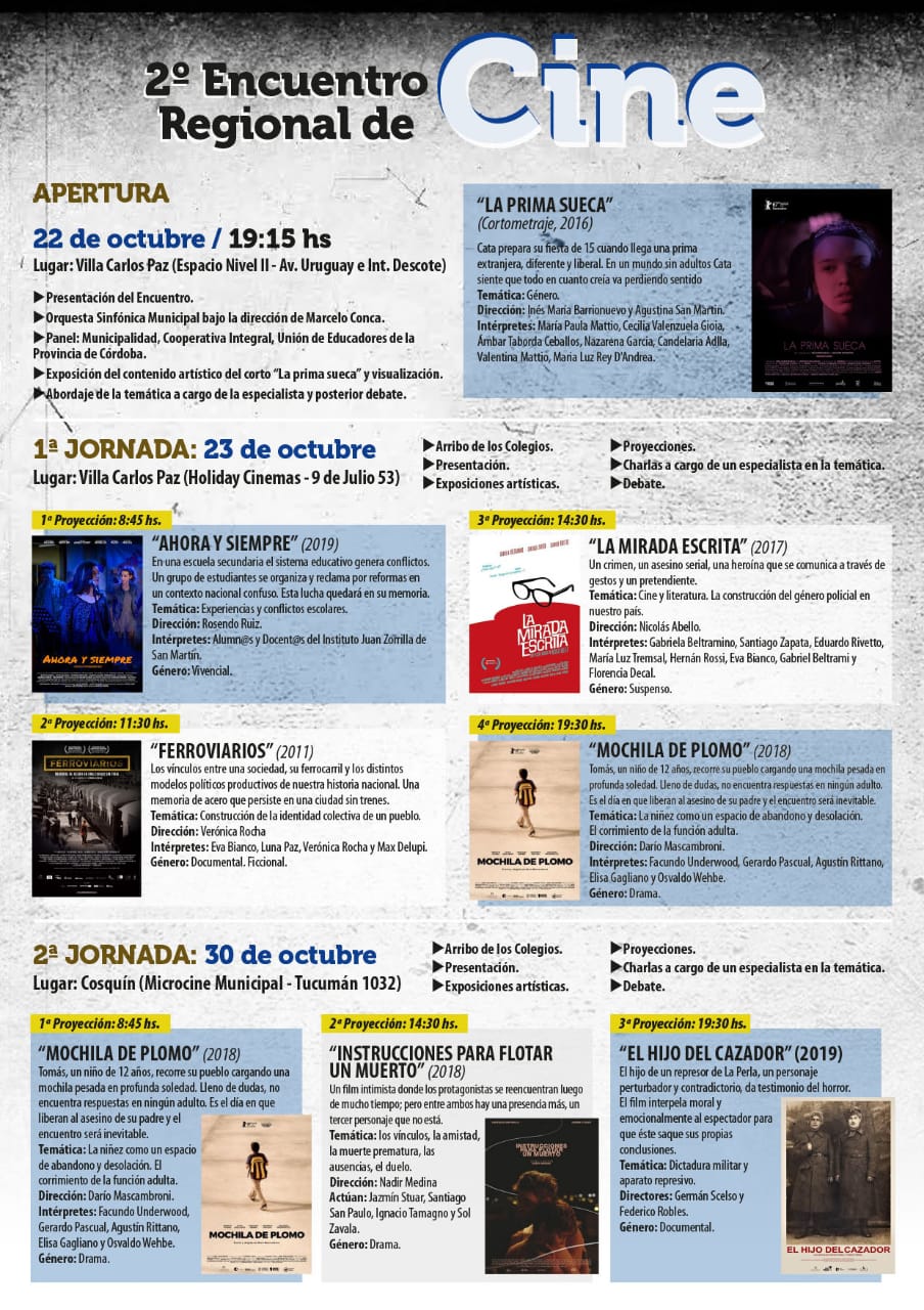 Los filmes que se proyectarán a lo largo del “ 2º Encuentro Regional de Cine” son: “Ahora y siempre” (2019) de Rosendo Ruiz, “Ferroviarios” (2011) de Verónica Rocha, “La mirada escrita” de Nicolás Abello, “La mochila de Plomo” (2018) Darío Mascambroni, “Instrucciones para flotar un muerto” (2018) de Nadir Medina, y el documental del 2019, “El hijo del cazador”, de German Scelso y Federico Robles, sobre la dictadura militar y el aparato represivo.