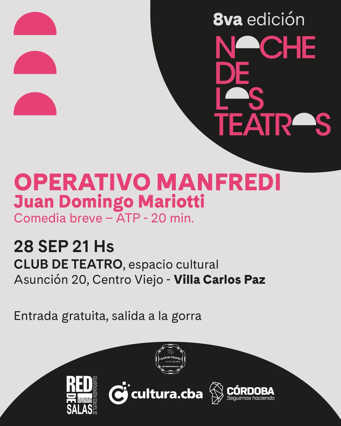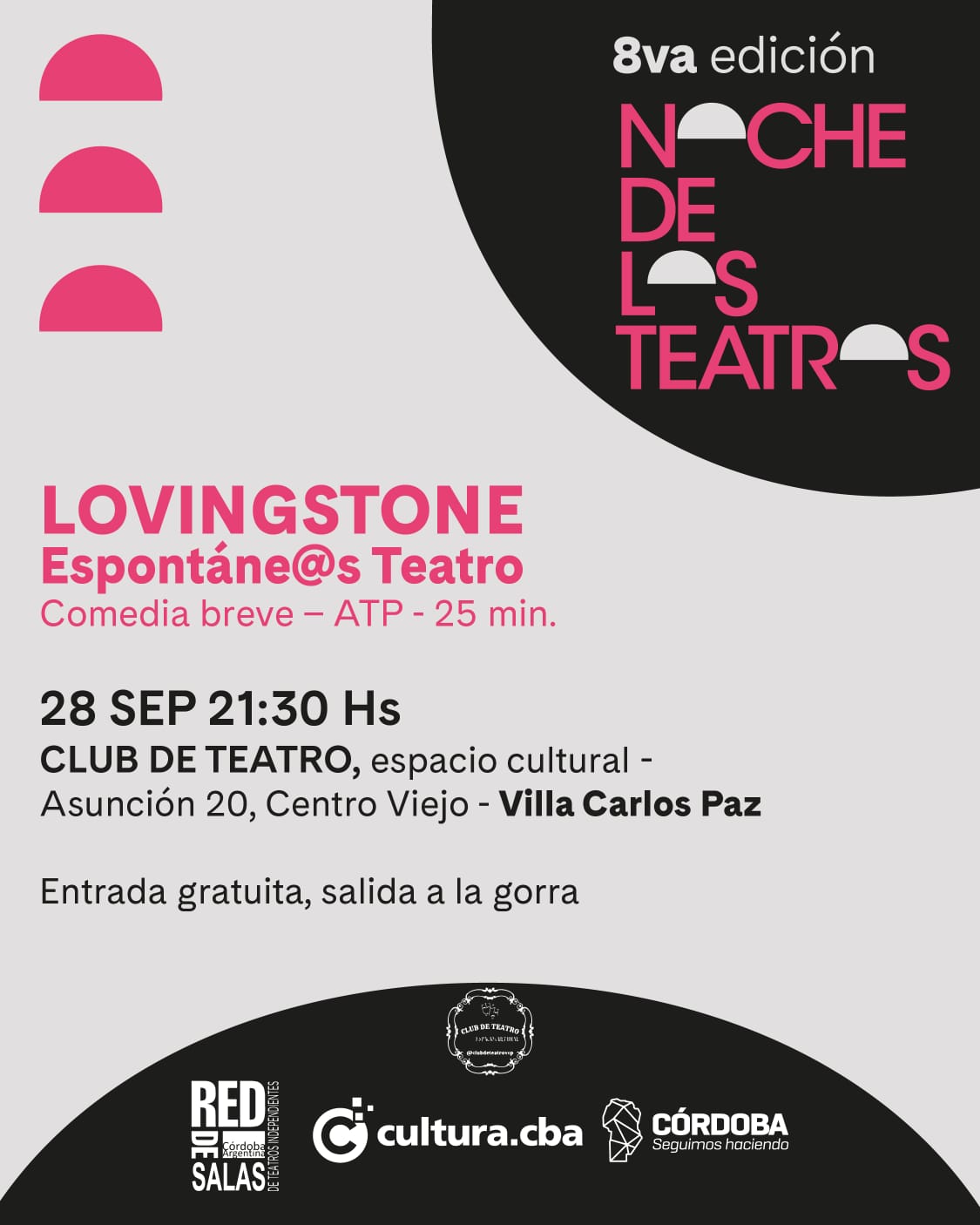 Este 28 de septiembre llega “La Noche de los teatros” a Carlos Paz . Por primera vez, este evento impulsado desde Cultura de la provincia de Córdoba, llega a nuestra ciudad y al Club del Teatro, en calle Asunción 20, Centro viejo, a partir de las 20,30 hs.